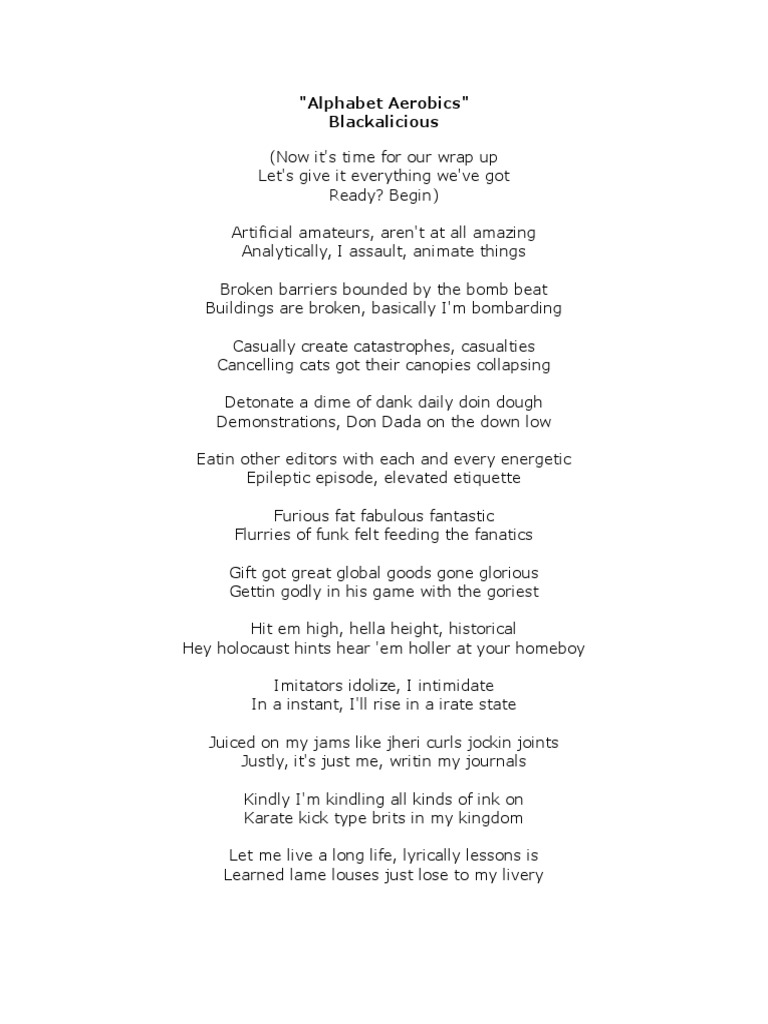 When i'm on the mic, i stand tall with gall style ; (now it's time for our wrap up let's give it everything ; Video clip and lyrics alphabet aerobics by blackalicious. Lyrics to alphabet aerobics by blackalicious. Artificial amateurs, aren't at all amazing analytically, i assault, animate things broken barriers . Let's give it everything we've got. "alphabet aerobics" is the most popular track off blackalicious' 1999 ep a2g. (now it's time for our wrap up. Let's give it everything we've got . Now it's time for our wrap up. Now it's time for our wrap up let's give it everything we've got ready? It features gift of gab tearing up a simple beat (provided by cut chemist rather . (now it's time for our wrap up let's give it everything we've got ready?